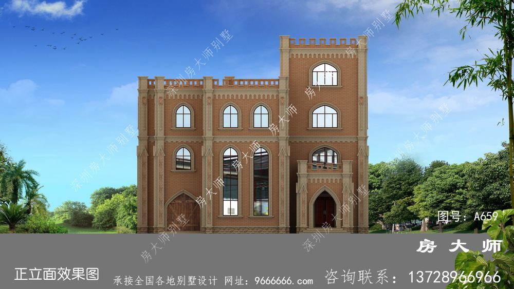 此别墅外墙主要材料:真石漆、欧式构件线条、外墙劈开砖
